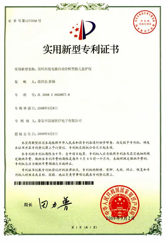 公司研發(fā)的電腦自動分析型胎兒母嬰監(jiān)護(hù)儀,獲得國家發(fā)明專利,2011年榮獲國家科技部創(chuàng)新技術(shù)產(chǎn)品,該產(chǎn)品解決了婦產(chǎn)科醫(yī)護(hù)人員 普遍不會胎兒監(jiān)護(hù)圖形分析診斷的困惑,極大促進(jìn)了胎兒監(jiān)護(hù)的臨床應(yīng)用與發(fā)展!開創(chuàng)了中國胎兒監(jiān)護(hù)自動分析新時代!市場前景極其廣闊!