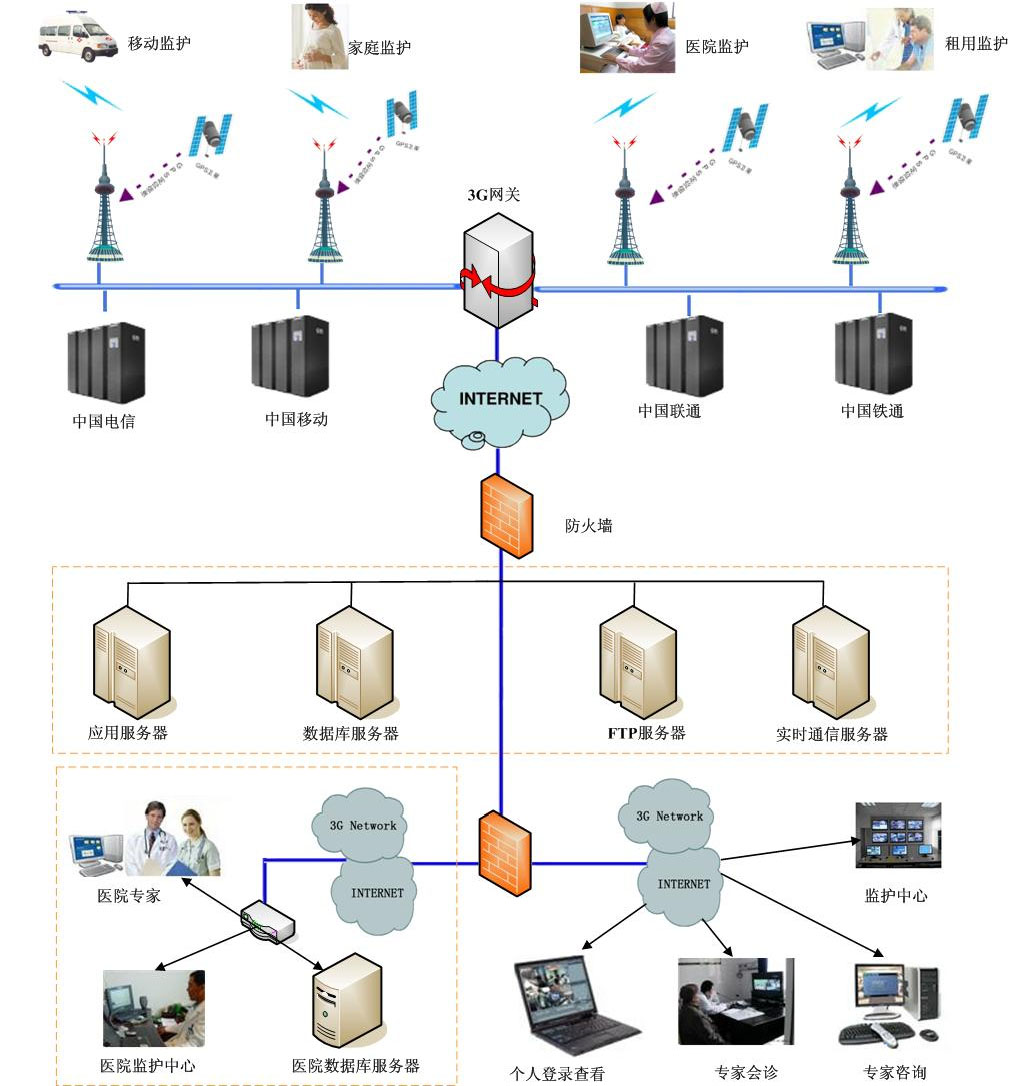 整個(gè)系統(tǒng)有遠(yuǎn)程監(jiān)護(hù)網(wǎng)絡(luò)服務(wù)器集群、遠(yuǎn)程監(jiān)護(hù)工作站、若干監(jiān)護(hù)終端及各種應(yīng)用軟件及數(shù)據(jù)庫(kù)管理軟件組成。遠(yuǎn)程監(jiān)護(hù)網(wǎng)絡(luò)服務(wù)器集群提供監(jiān)護(hù)信息實(shí)時(shí)遠(yuǎn)程傳輸、分析、存儲(chǔ)及數(shù)據(jù)庫(kù)管理等后臺(tái)軟硬件技術(shù)支持和服務(wù),對(duì)用戶不可見(jiàn)。